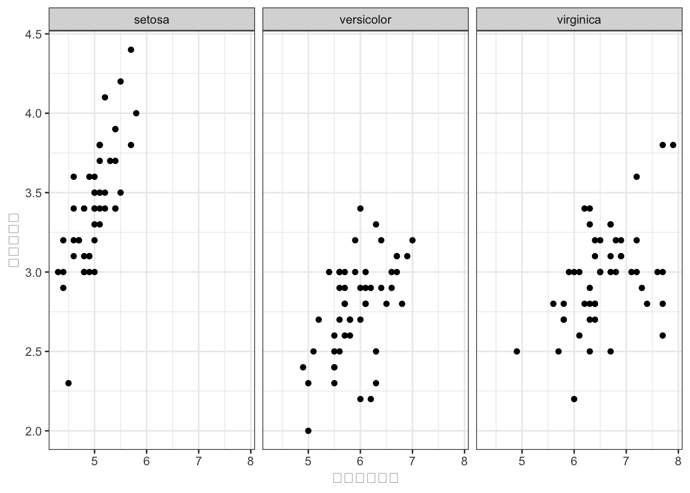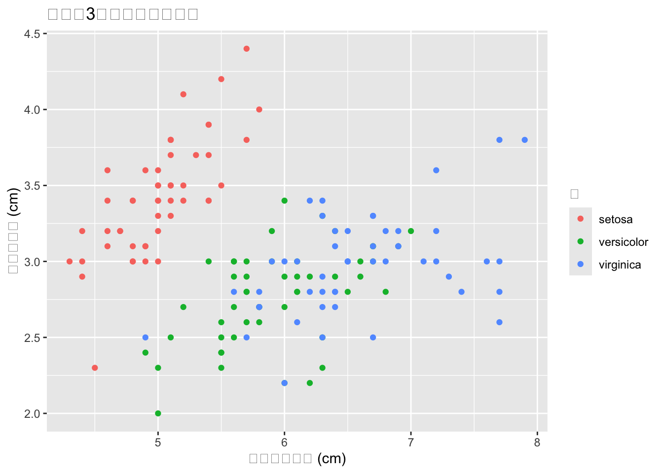 facet_wrap()でSpeciesの3水準がそれぞれ別パネルに表示されます。全パネルで軸の範囲が揃うので、比較が容易です。