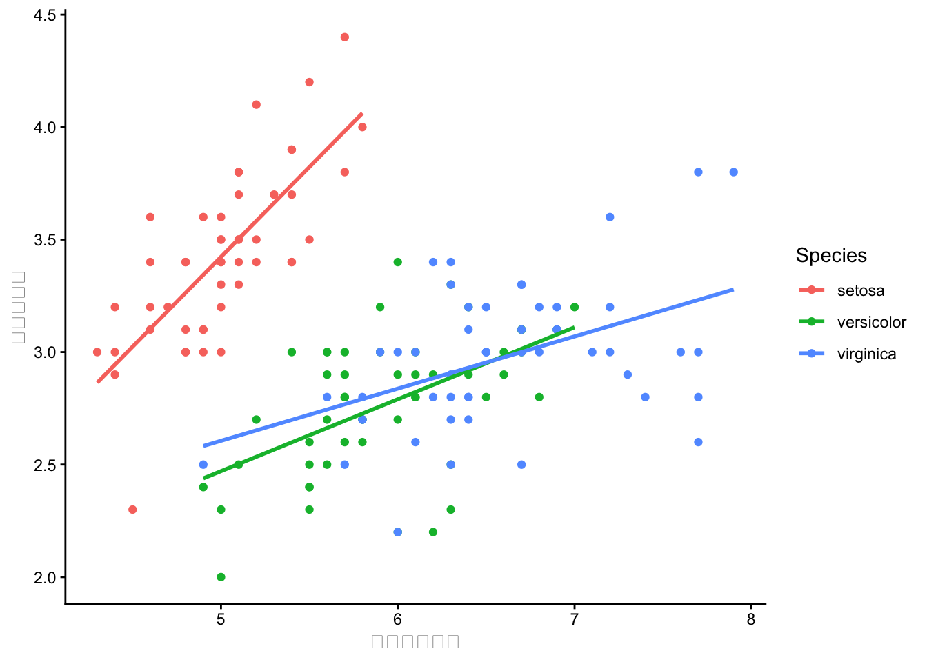 geom_smooth(method = "lm")で回帰直線を追加します。aes(color = Species)がggplot全体に設定されていれば、geom_smoothもSpeciesごとに分かれます。