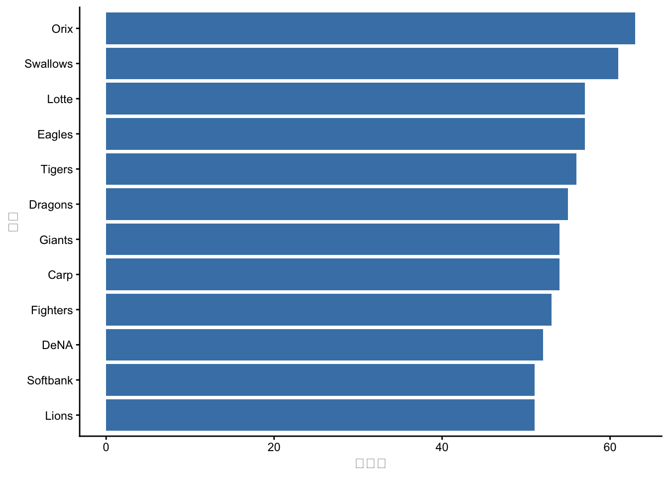 reorder(team, team, length)は、teamをその出現回数(length)で並べ替えます。coord_flip()で軸を反転させると、長い球団名も読みやすくなります。