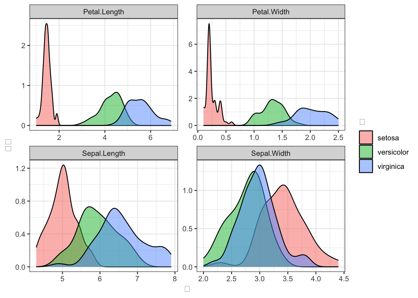ggplot2::labs(x = "値", y = "密度", fill = "種") +