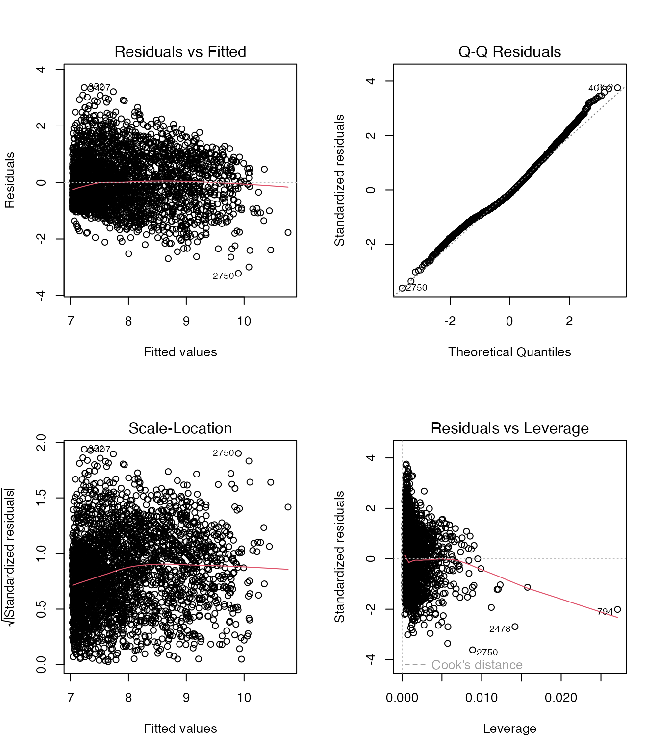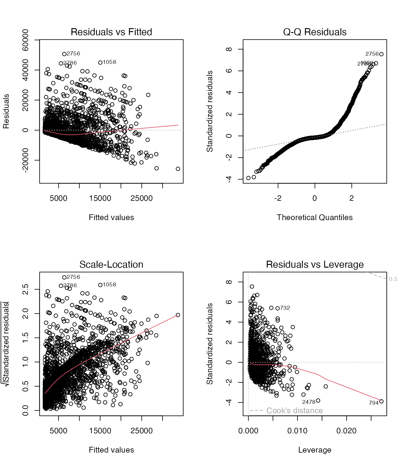 - Residuals vs Fitted: 右に行くほど残差が広がる傾向(等分散性の仮定が怪しい)