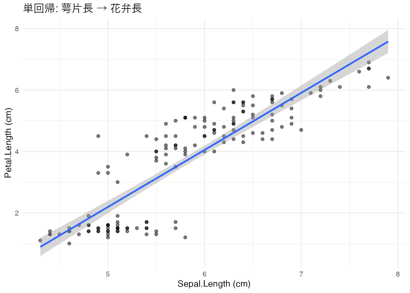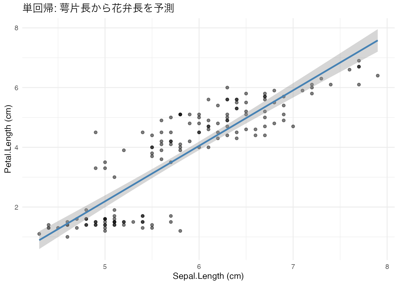 labs(title = "単回帰: 萼片長から花弁長を予測",
