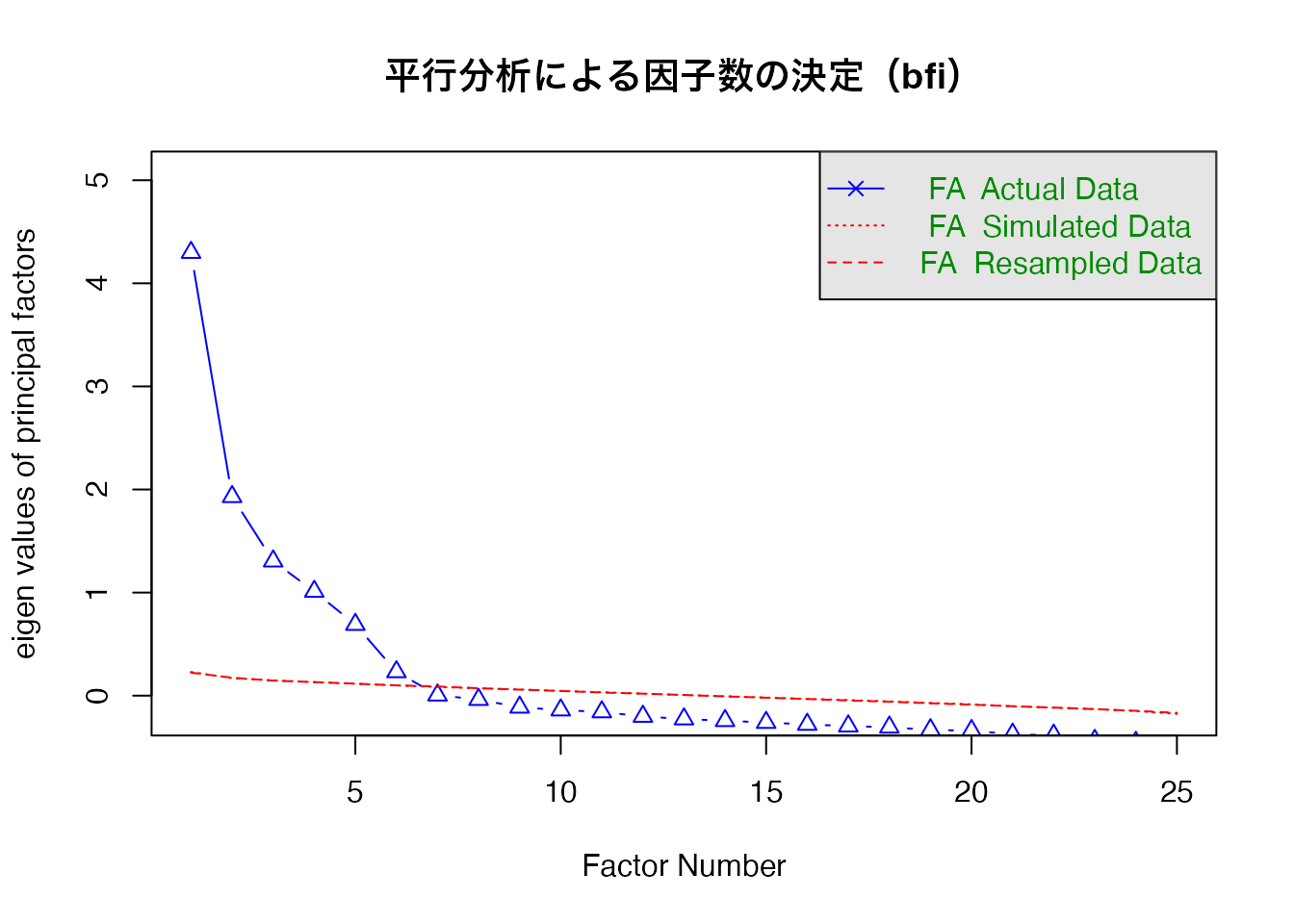 因子数の決定には 平行分析(parallel analysis) が推奨されます。ランダムデータから得られる固有値と実データの固有値を比較し、実データの固有値がランダムデータを上回る因子数を採用します。