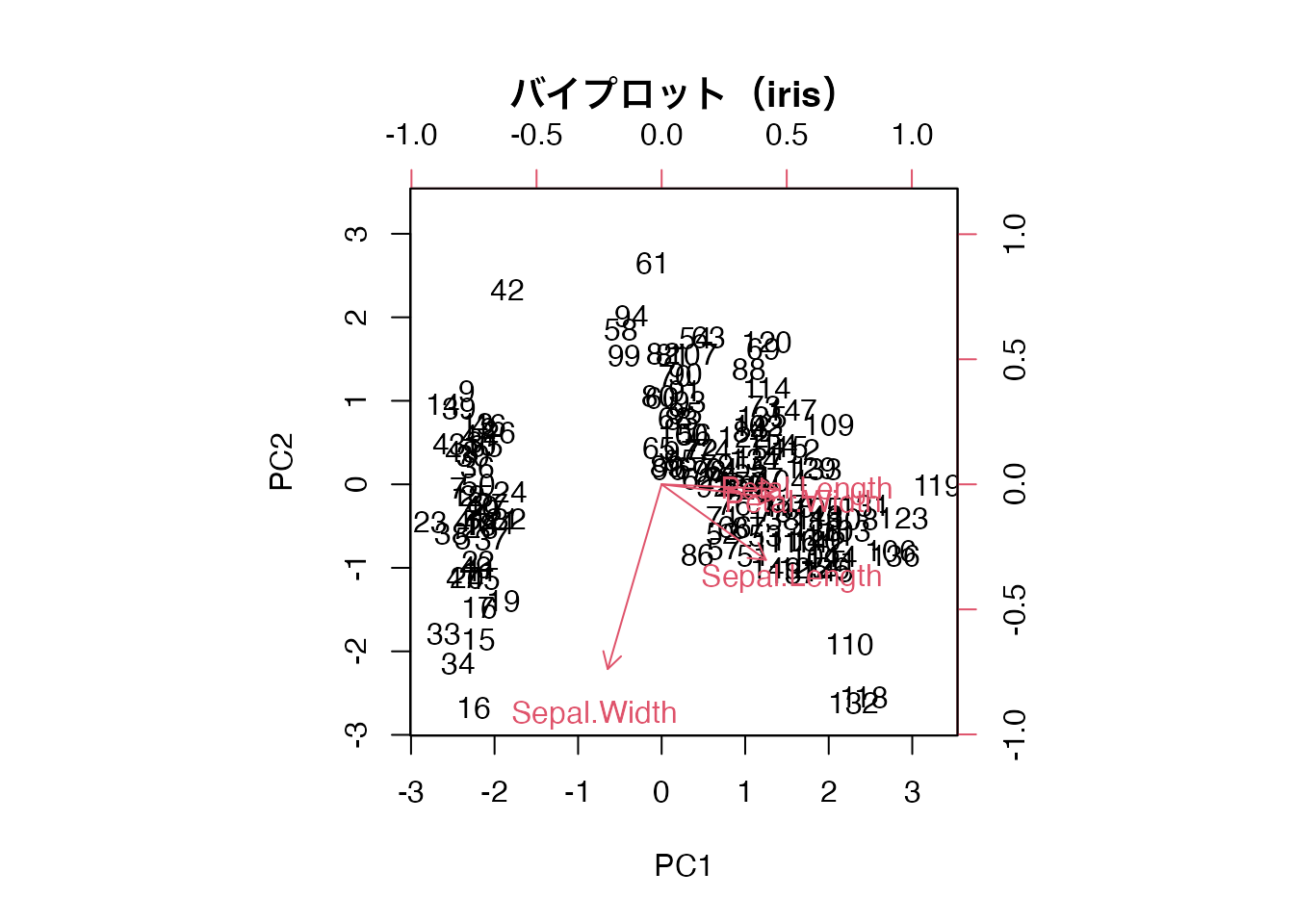 main = "バイプロット(iris)",