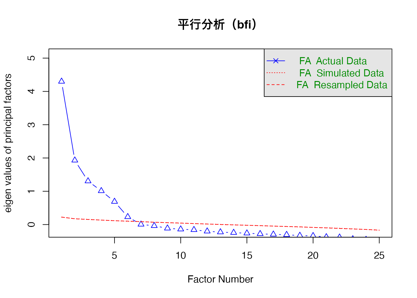 psych::fa.parallel(bfi_data, fa = "fa", main = "平行分析(bfi)")
