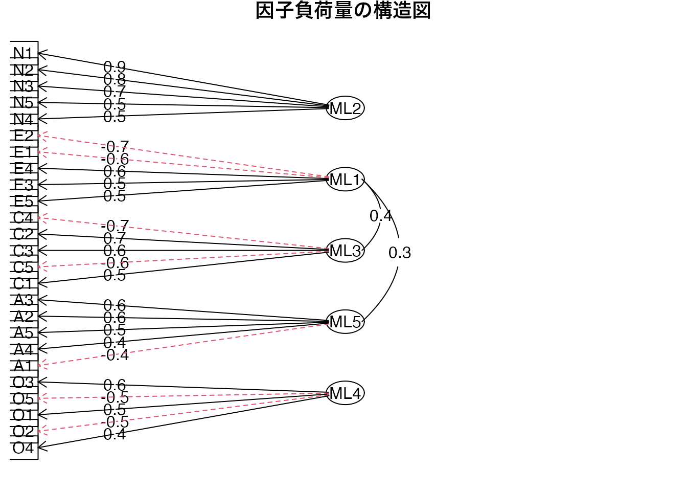 - lavaanで5因子CFAモデルを指定する(A1-A5, C1-C5, E1-E5, N1-N5, O1-O5の各5項目が対応する因子に負荷)