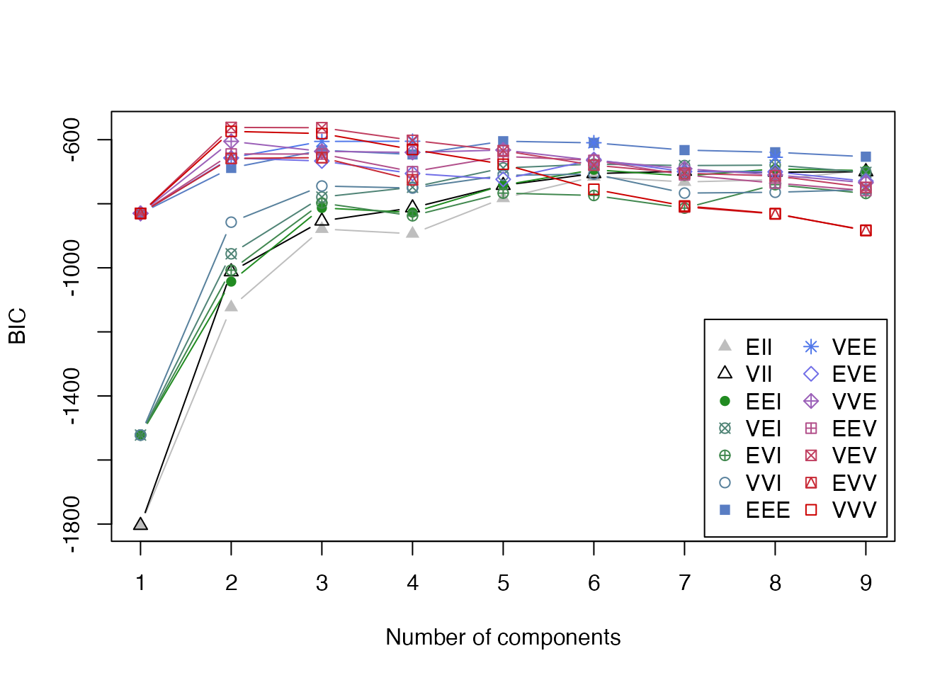BICプロットでは、横軸がクラスター数、縦軸がBIC値を示します。BICが最大となるモデルが最適として選択されます。モデル名の3文字コード(例: VEV)は、クラスターの体積(Volume)、形状(Shape)、向き(Orientation)がそれぞれ等しい(E)か異なる(V)かを示しています。
