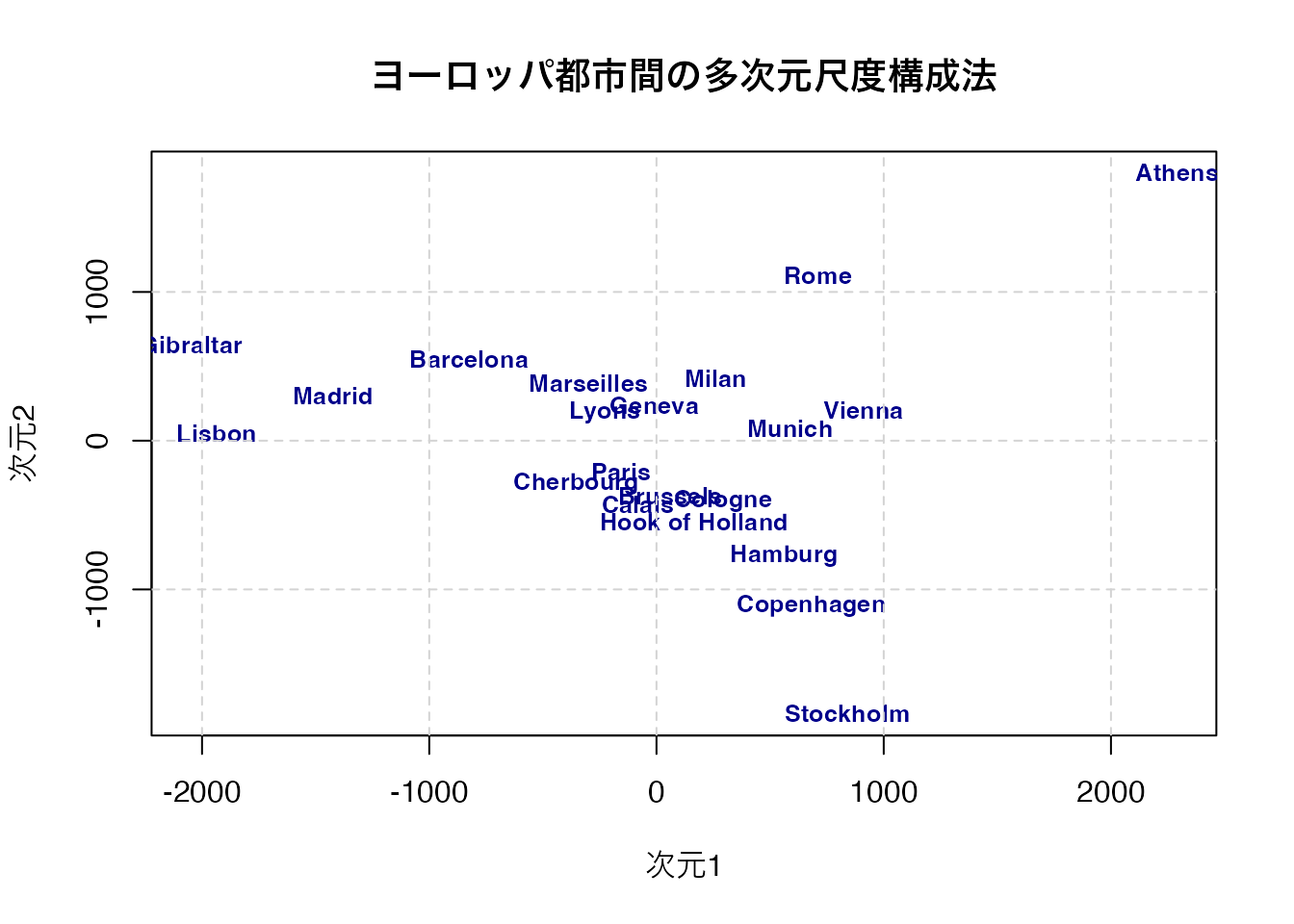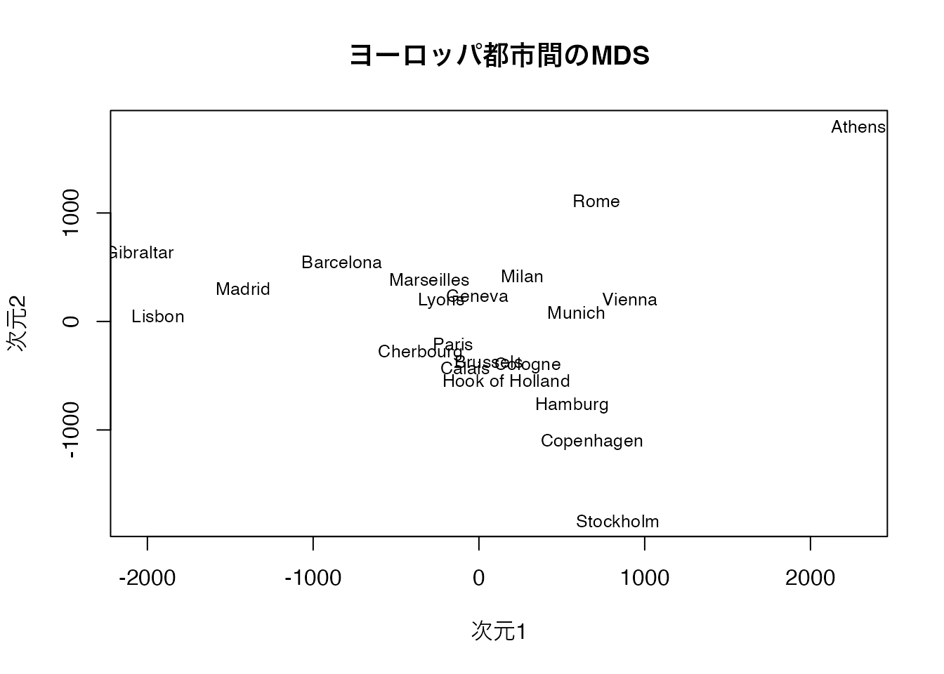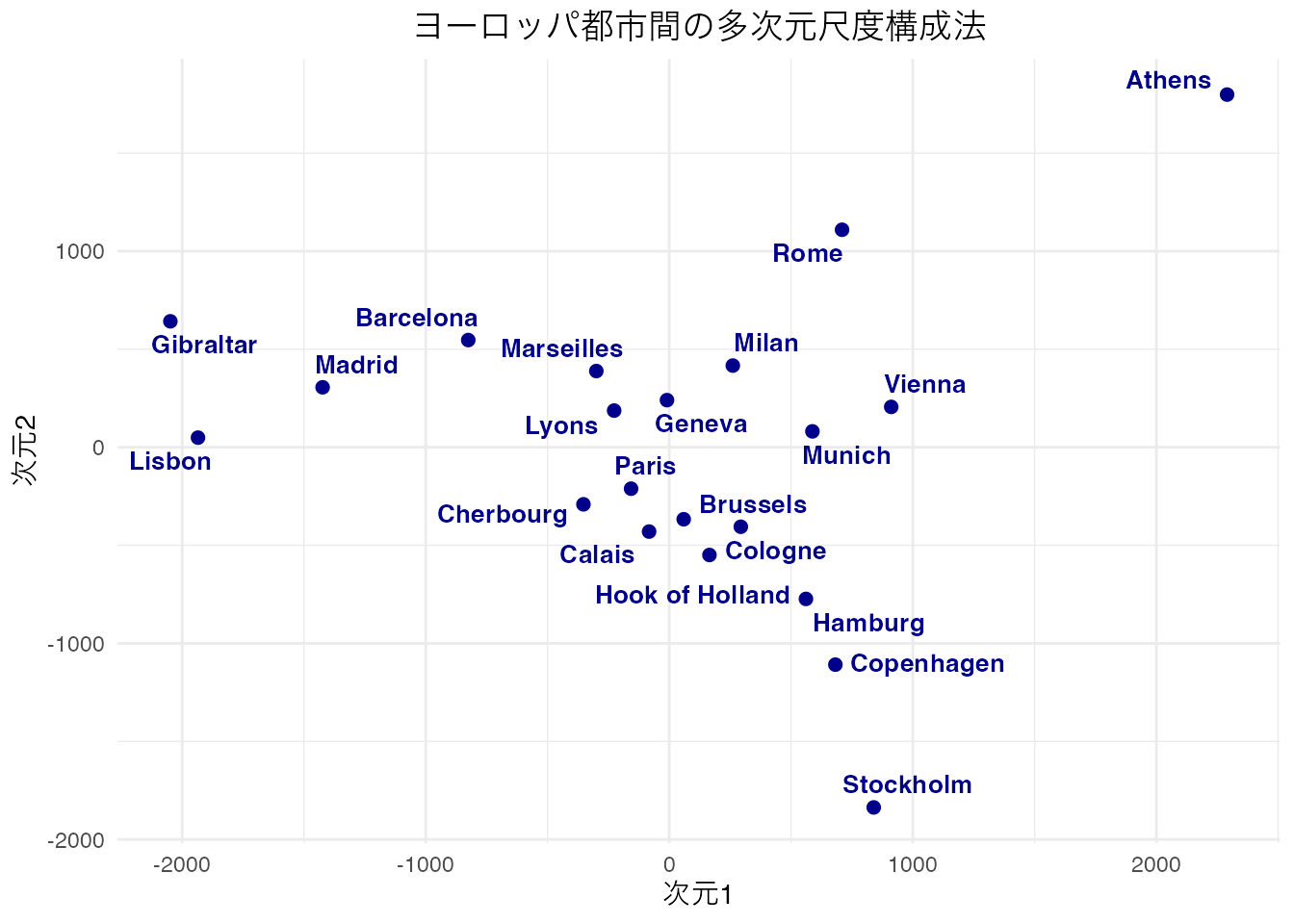 labs(title = "ヨーロッパ都市間の多次元尺度構成法",