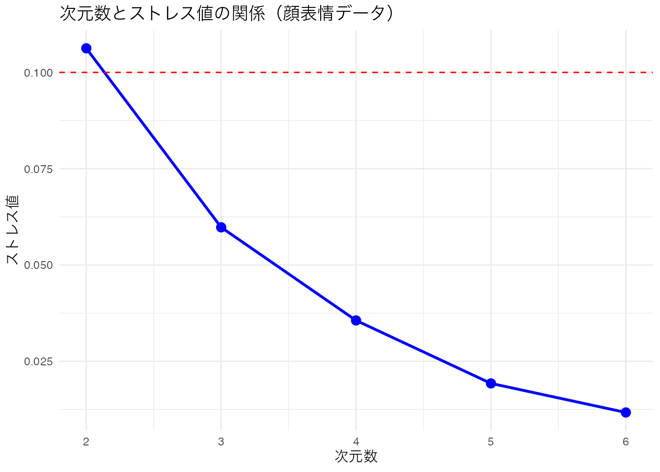 赤い破線はストレス値 = 0.1(良好の基準)です。ストレス値が急激に減少する「肘」の位置や、ストレス値が0.1を下回る次元数を目安に、適切な次元数を判断します。