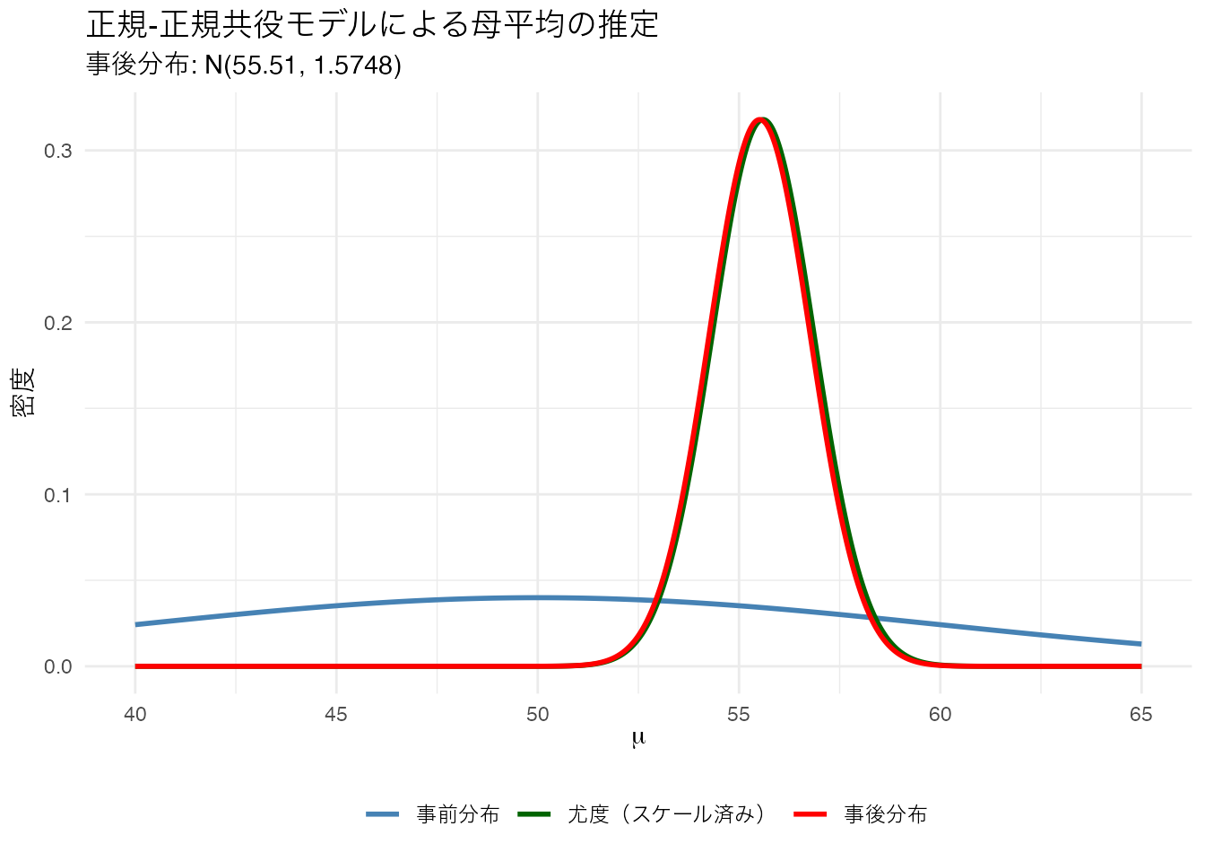 # 尤度をプロット用にスケーリング(最大値を事後分布の最大値に合わせる)