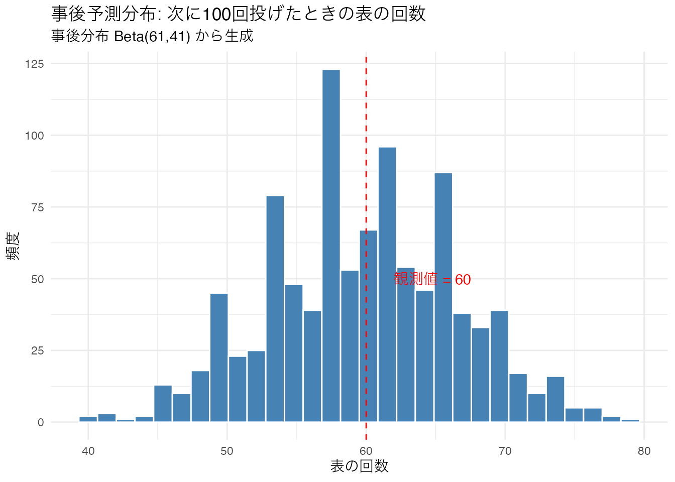 事後予測分布は「このモデルが正しいなら、次のデータはどのような値を取りうるか」を示します。観測値(60回)がこの分布の中心付近にあるかを確認することで、モデルの妥当性を評価できます(事後予測チェック)。