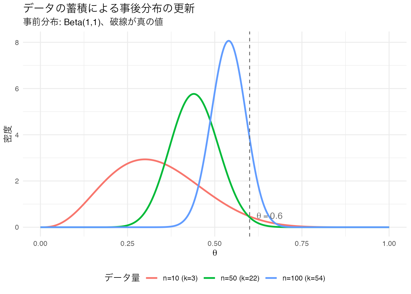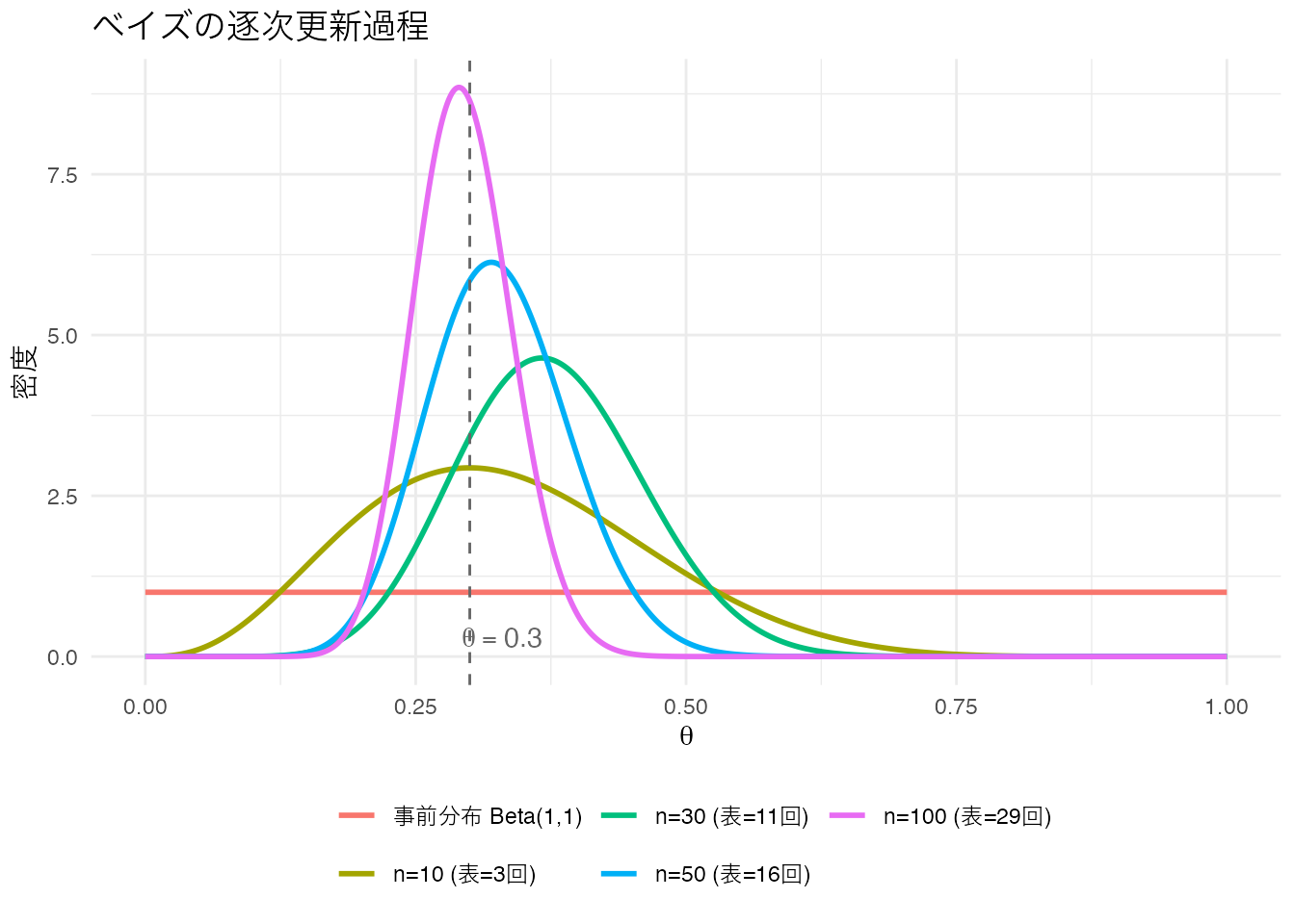 データが増えるにつれて事後分布が真の値 0.3 の周辺に集中していく様子がわかります。最初の事前分布 Beta(1,1) は平らですが、データの蓄積とともに情報が更新されていきます。