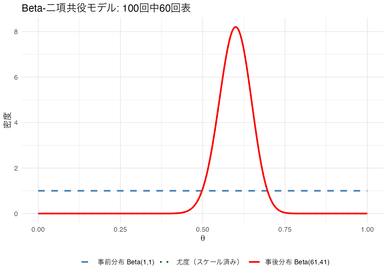 labs(title = "Beta-二項共役モデル: 100回中60回表",