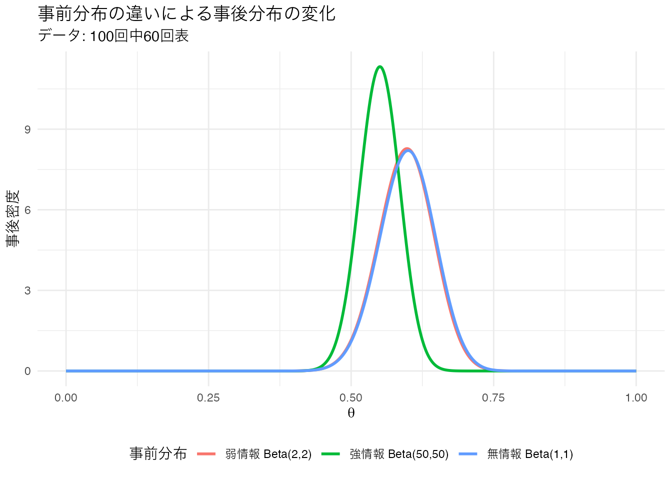 同じデータ(100回中60回表)に対して、異なる事前分布がどのように事後分布を変えるか見てみましょう。