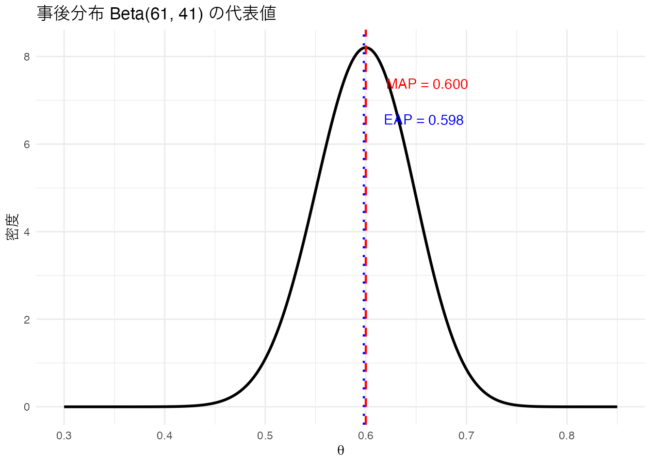 - MAP推定とEAP推定: 事後分布の最頻値と期待値。それぞれ異なる代表値を与える