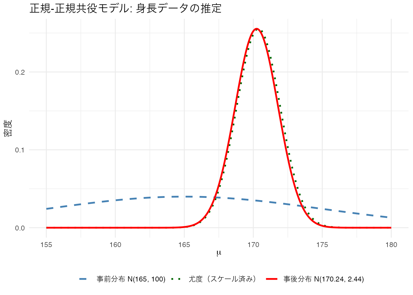 ベイズの定理を具体的に計算するには、事前分布と尤度を掛け合わせて事後分布を求めます。事前分布と事後分布が同じ種類の確率分布になるとき、その事前分布を 共役事前分布(conjugate prior) と呼びます。共役事前分布を使うと、事後分布の形が解析的にわかるため、計算が容易になります。