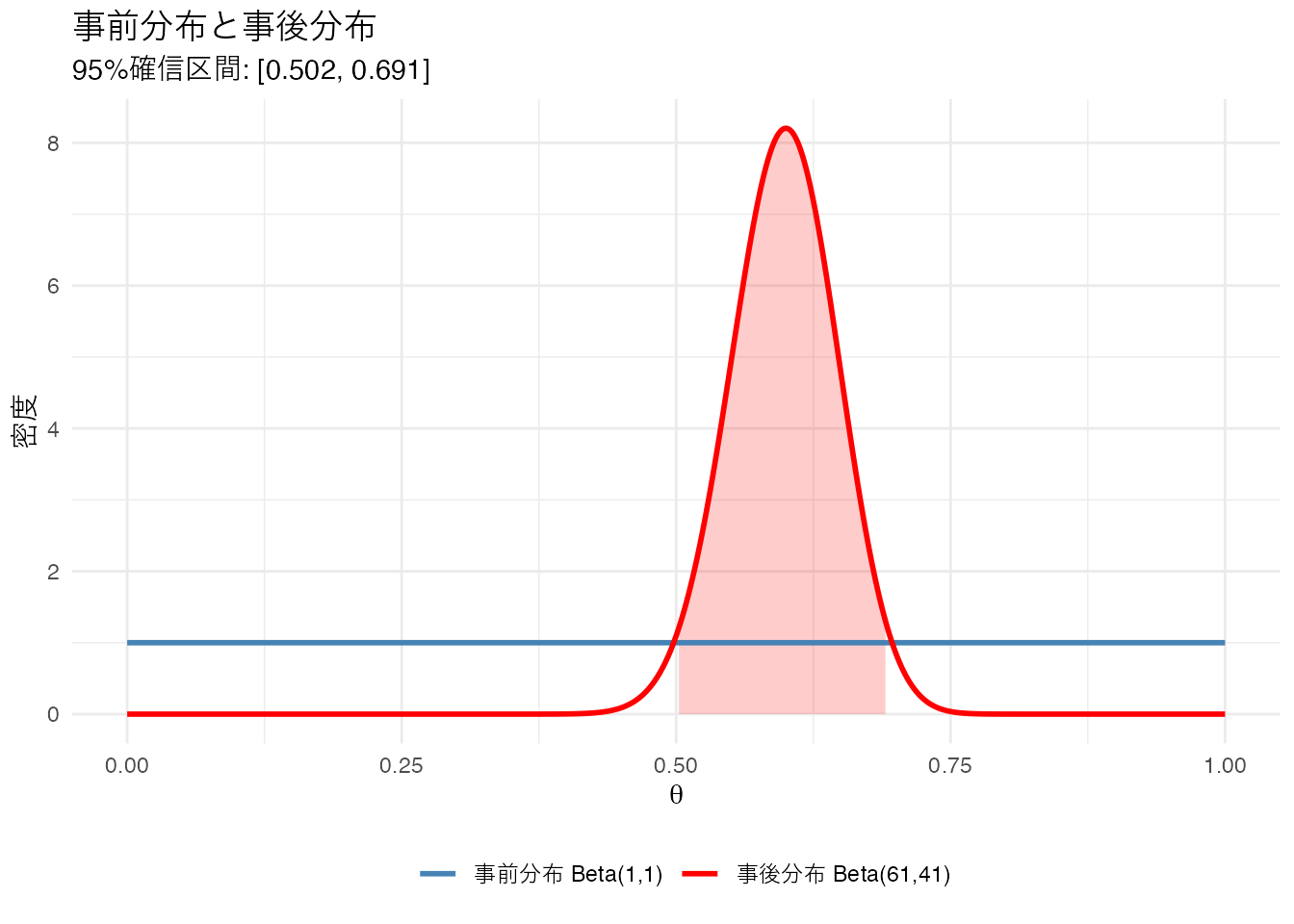 - 無情報事前分布(uninformative prior): 特定の値に偏らない。例: Beta(1, 1) = 一様分布