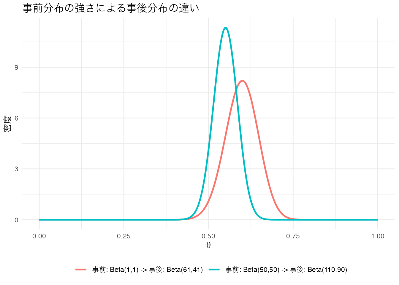 - 強情報事前分布(informative prior): 先行研究などに基づく強い事前知識。例: Beta(50, 50)