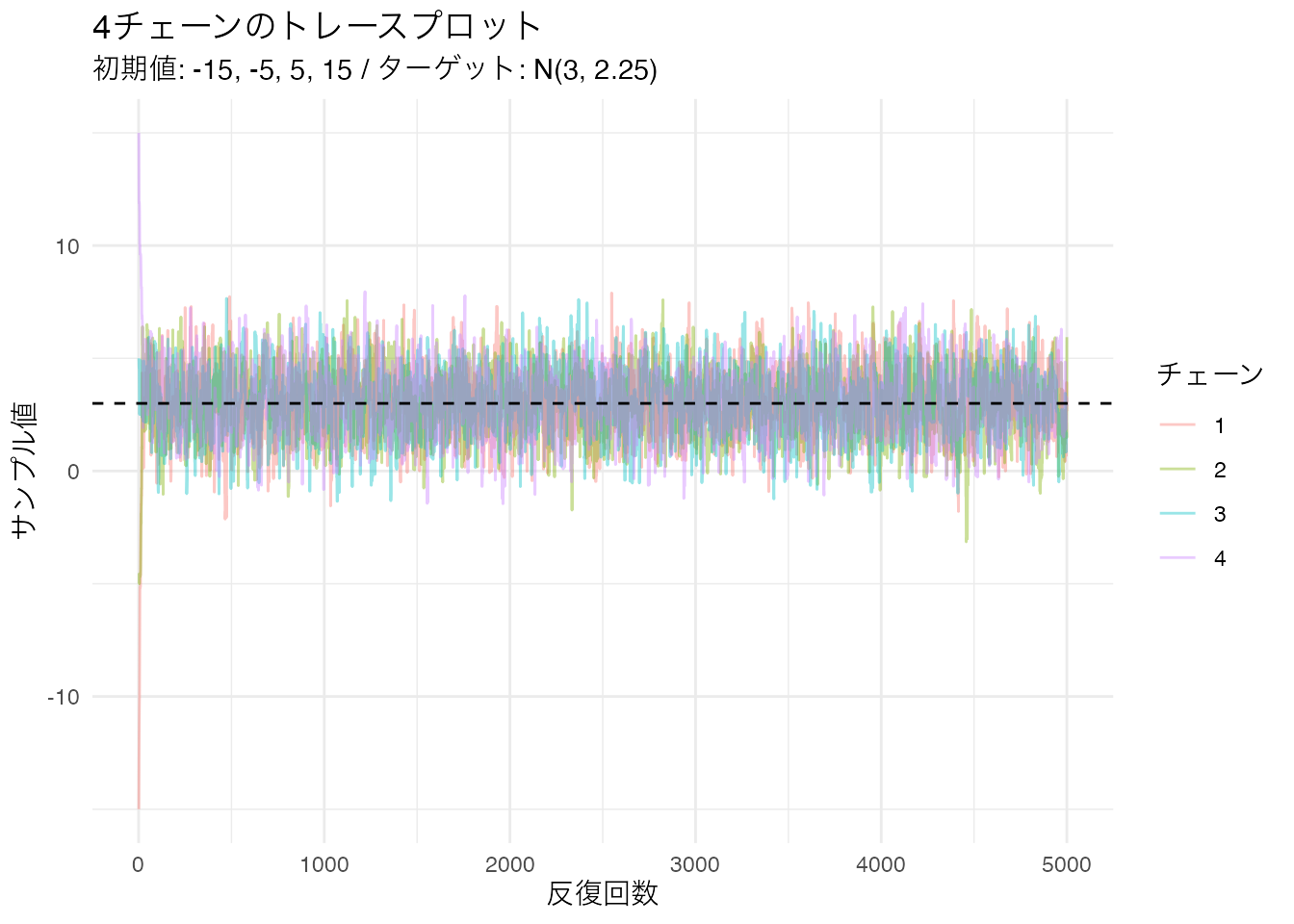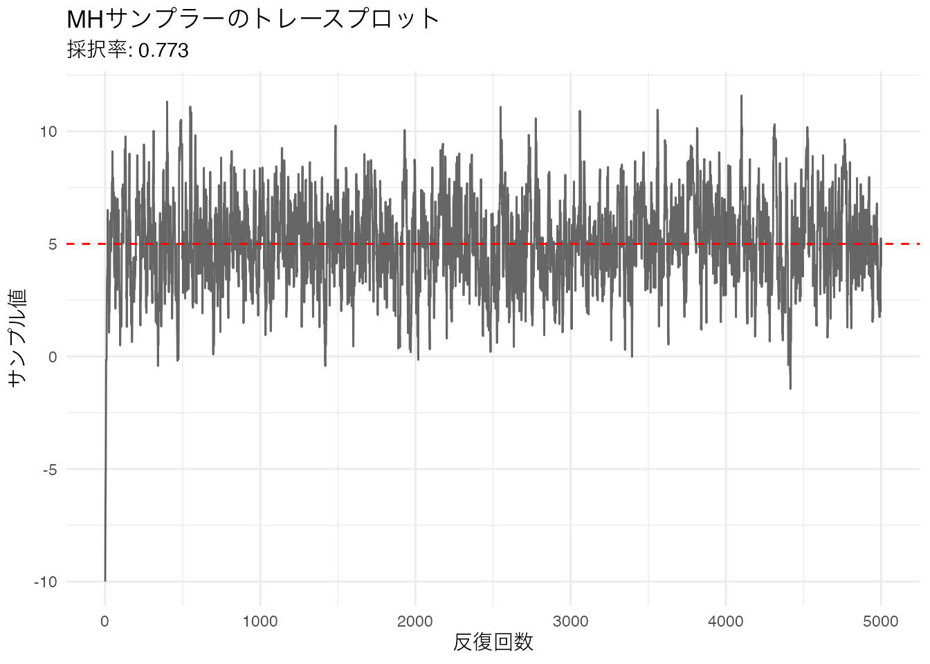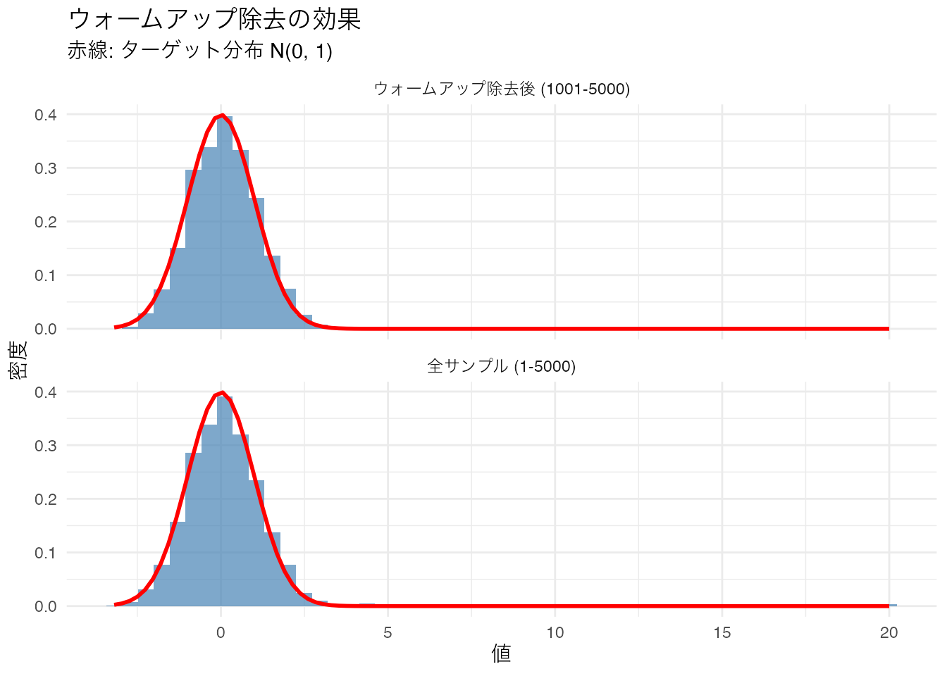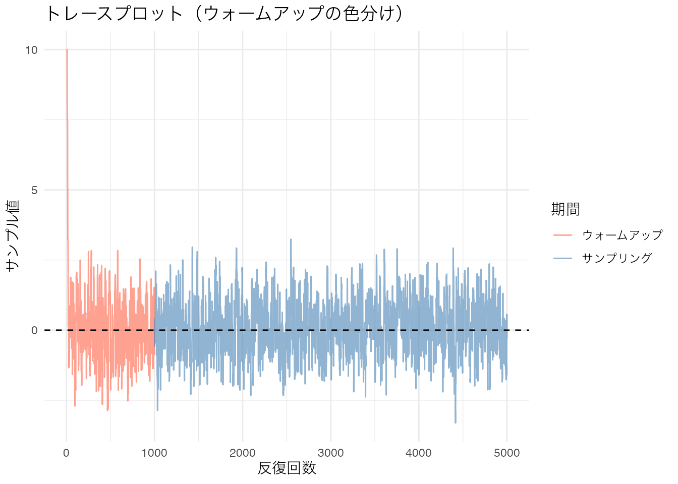 初期値 \(-10\) から始まっているため、最初の数百回は真の値(赤い破線)に到達するまでの過渡期になっています。この部分を ウォームアップ(warm-up) または バーンイン(burn-in) と呼びます。