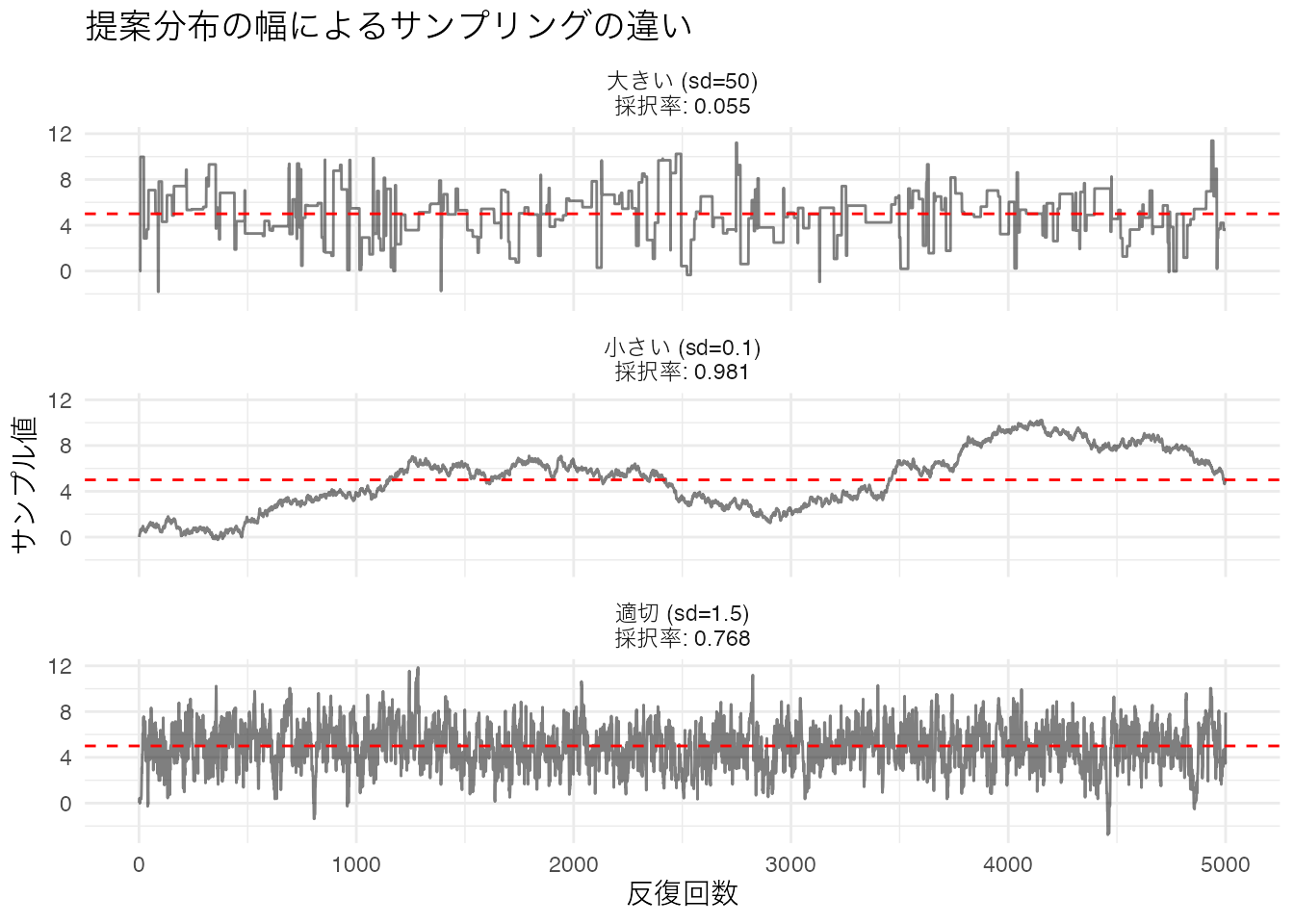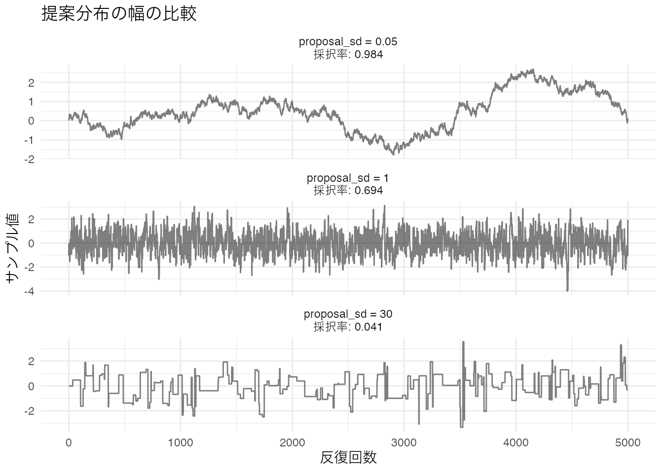 par(mfrow = c(1, 1))- \(\sigma_{\text{prop}} = 0.05\): 自己相関が非常にゆっくり減衰しており、隣接サンプル間の依存が強い。ESSは低くなる